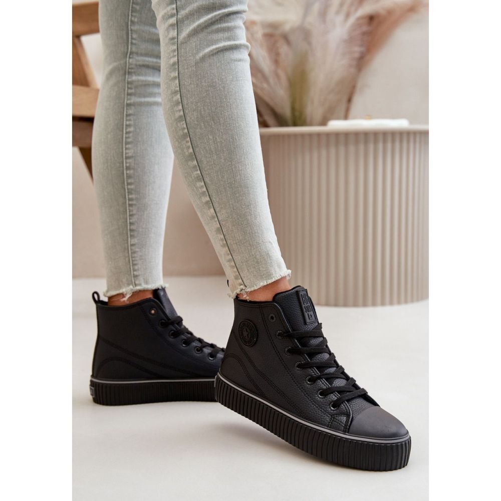 Model Big Star OO274790 Black - Step in Style sneakers are the perfect combination of comfort and fashionable design that will work in every situation. Made of high quality ecological leather, these black sneakers are not only stylish, but also environmentally friendly. An additional ankle upper and a solid, rubber platform with a height of 3.5 cm guarantee stability and comfort of wearing.