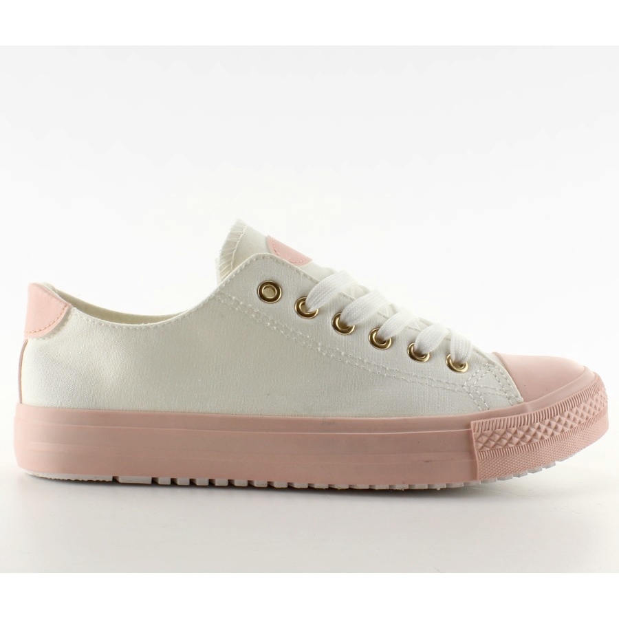 Charming, low women's sneakers in an original version - classic white canvas combined with subtle, pastel rubber in shades of pink. The model with a neat cut, rounded toe and lace-up fastening will be perfect for both everyday and casual styling.
