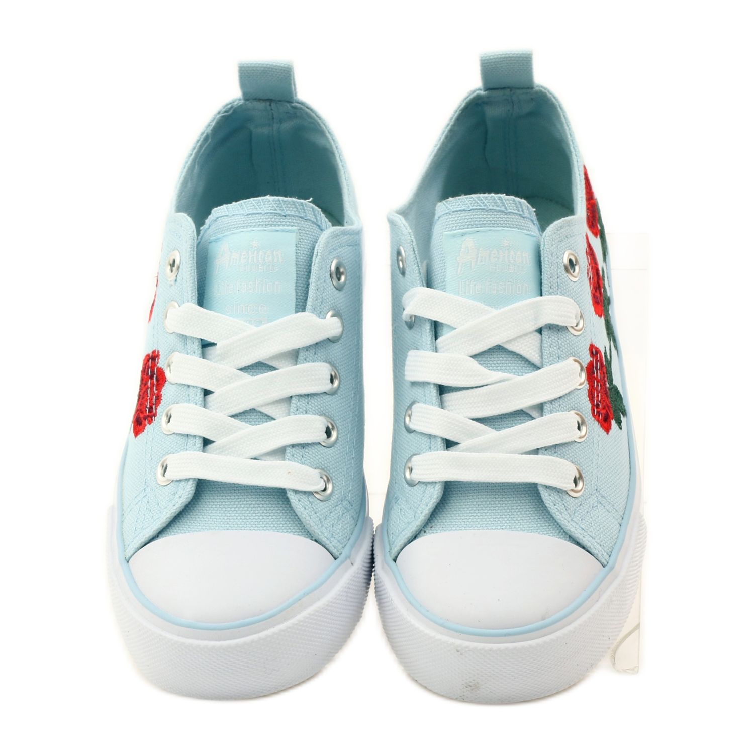 American Club sneakers model 17035 are a great choice for every girl who values comfort and a fashionable look. These unique sneakers in a beautiful combination of colors: red, blue and white, are decorated with charming embroidered roses, which give them an extraordinary character.