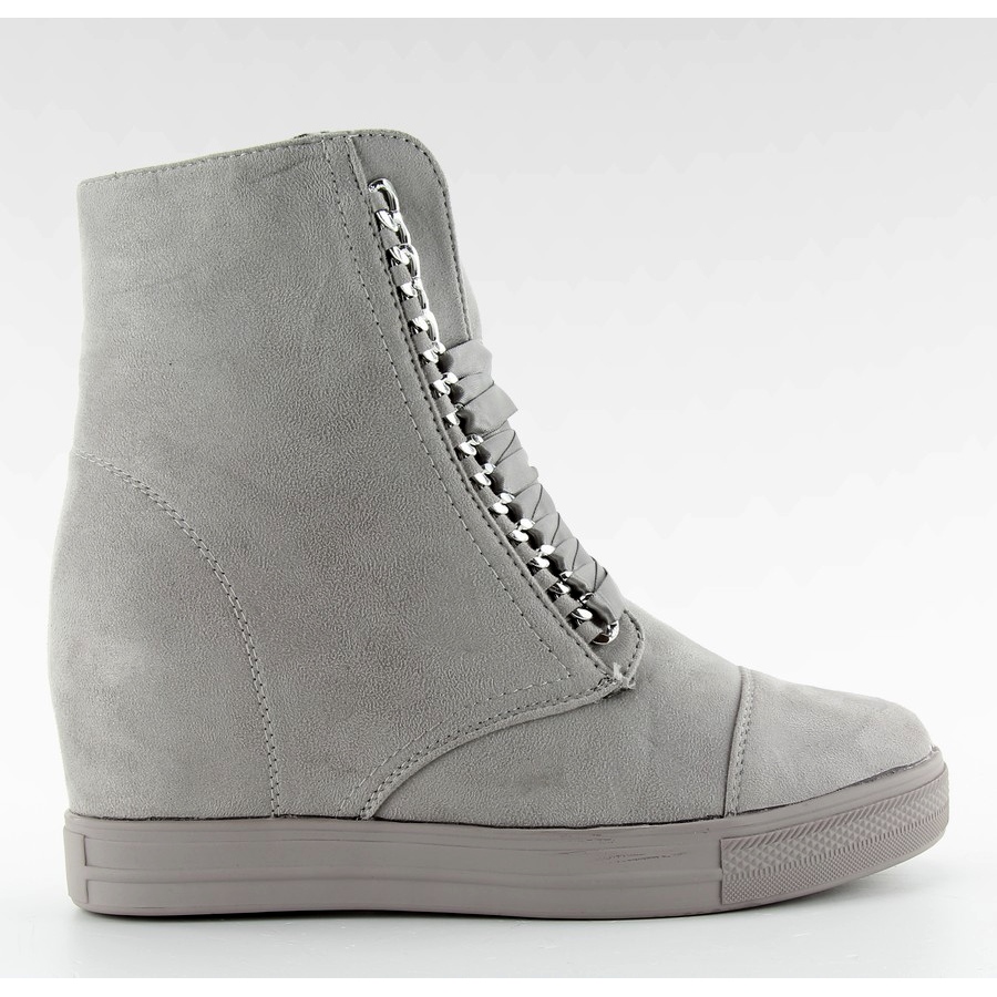 Extremely shapely NC92 sneakers in gray combine a subtle, slim design with practical solutions. Made of ecological suede, set on a hidden 7.5 cm high heel, they subtly slim the figure and add centimeters without losing comfort. Decorative lacing with a satin ribbon gives them a feminine character, and a hidden zipper on the inside makes them easy to put on quickly. The interior is fully lined with delicate fur - perfect for colder days.