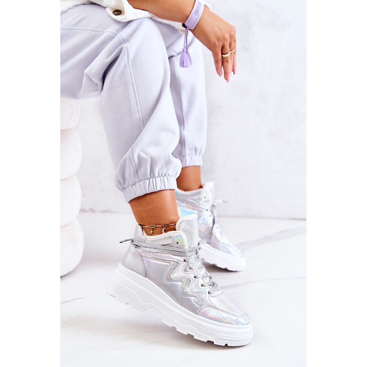 Modern, high sports shoes Joenne combine fashionable, metallic gloss with practical insulation properties. A thick, massive sole and soft fur inside provide warmth and comfort during cooler days, and the universal silver color will add character to many stylizations.