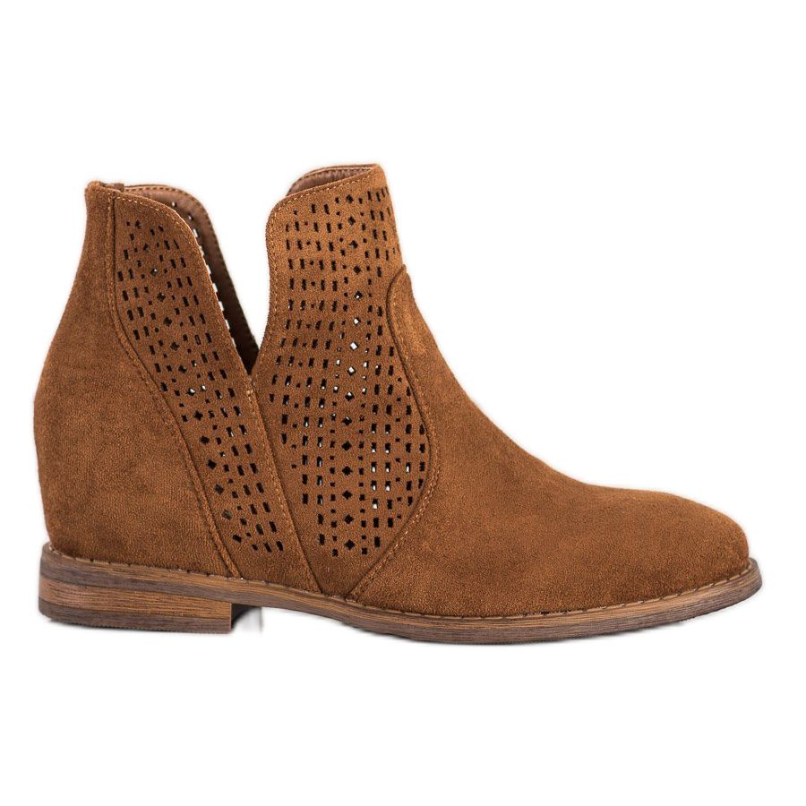 Made of ecological suede leather, the boots are distinguished by their openwork surface and practical cutouts that subtly expose the ankles. Their slip-on design makes them easy to put on, and the rounded toes add feminine charm. Additionally, the hidden 6 cm wedge provides comfort with every step and optically lengthens the legs, making them the perfect complement to many outfits.