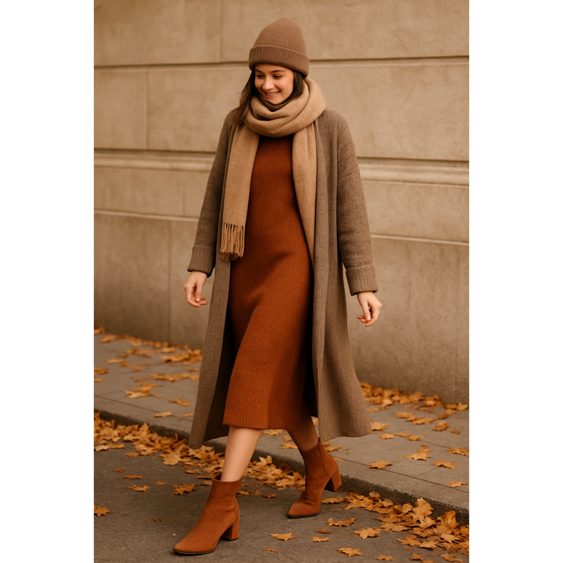 Autumn sweater dresses are another piece of clothing that looks phenomenal with square-toed ankle boots. Choose a looser model in a shade of ginger brown or mustard. Put on thick flesh-colored tights or a shade that matches the dress. Add flat or low-heeled ankle boots. Complete the look with a long cardigan and a hat in a matching color. This outfit is not only comfortable, but also extremely stylish and in line with autumn trends.