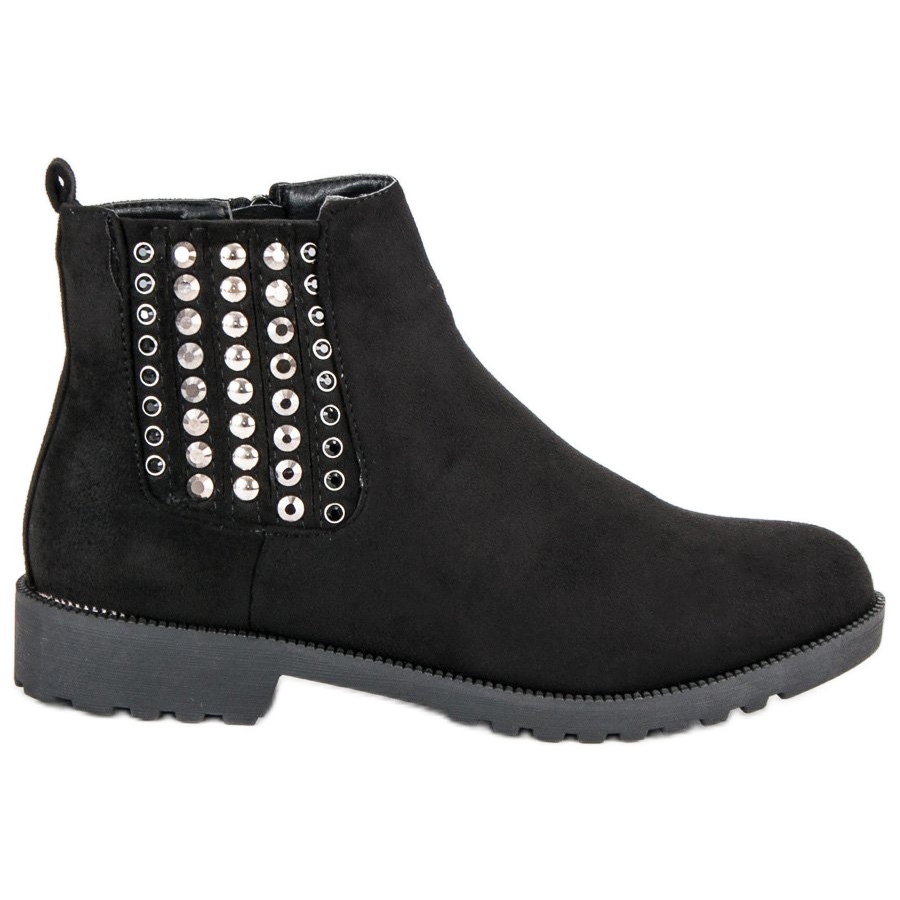 The black color and subtle, rounded shape of the toe add chic, and the delicate, flat 3.0 cm heel emphasizes the feminine shape of the shoes, while providing comfort in everyday use. Rows of shiny rhinestones are placed on the side of the Chelsea boots, which give them character and attract attention.