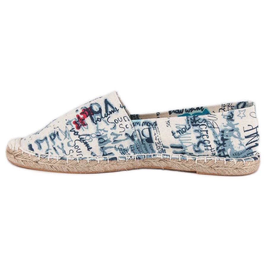Espadrilles are made of high-quality fabric, which makes them light and airy - perfect for warm days. A charming pattern with inscriptions adds character to them, and the colors in shades of white, blue and navy blue make them suitable for many styles, both everyday and more elegant.