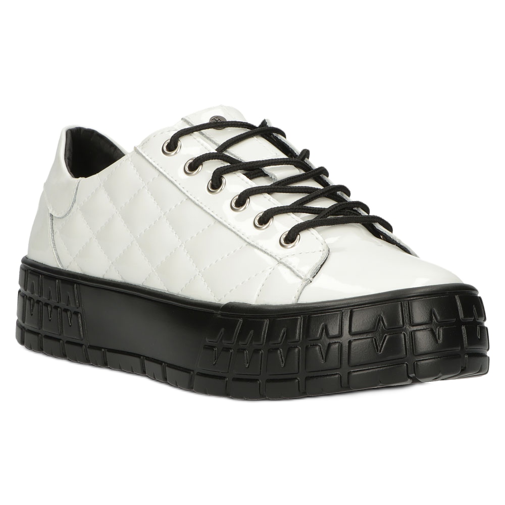 Elegant, varnished women's Filippo sneakers combine a classic design with a premium finish. White, shimmering natural leather fits perfectly into urban and casual stylizations, and the contrasting black sole and silver logo on the tongue give them character. Lace -up allows you to perfectly match the shoe to the foot, and the leather insole increases wearing comfort.