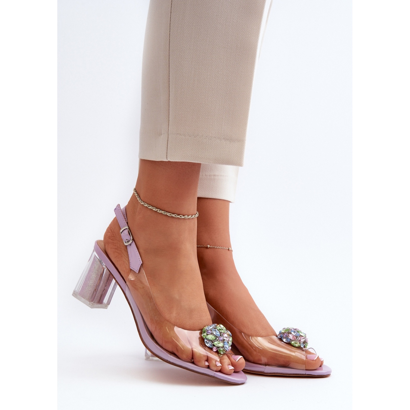 Sandals have a heel height of 6.5 cm, which emphasizes the figure and gives it a feminine character. Made of durable plastic, they are both stylish and practical. Charming rhinestones add shine, and the classic cut makes them fit many different styles.
