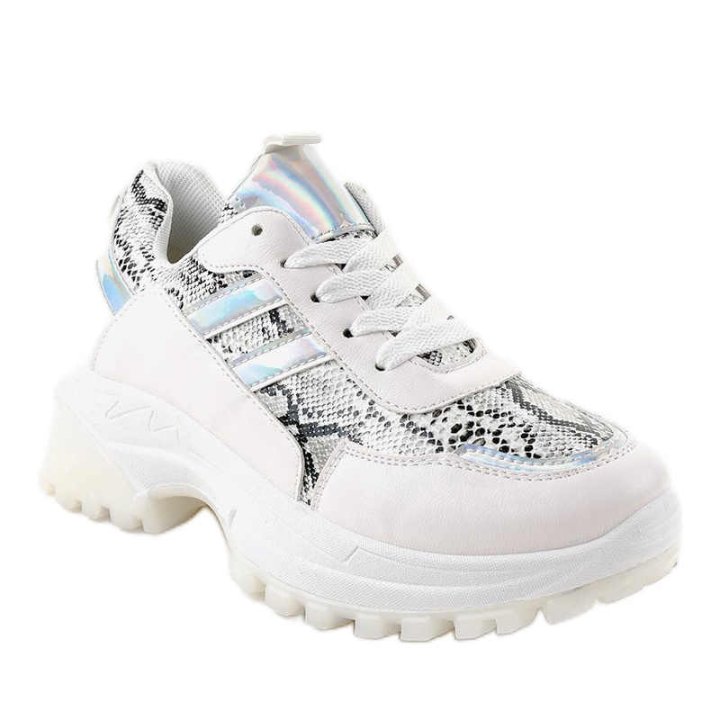 We present white stylish sports shoes 690051, which impress with their unique details and comfort of use. These women's sports shoes from another brand combine modern design with high quality workmanship. Made of leather-like material, stylized as snake skin, they offer a unique look that will perfectly complement any sports styling.