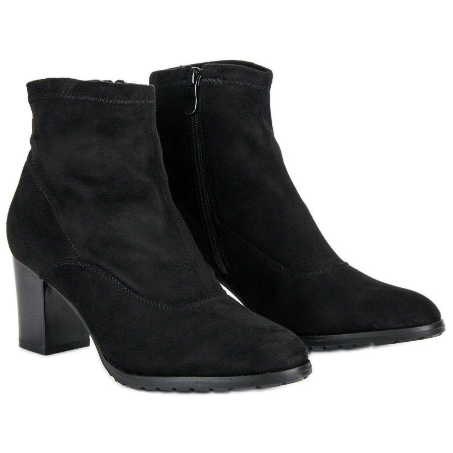 These black ankle boots with a block heel stand out with a beautifully fitting, narrow 12 cm high upper that perfectly highlights the shape of the legs. Thanks to their minimalist design, without unnecessary patterns, the ankle boots will fit into both elegant and casual stylings.