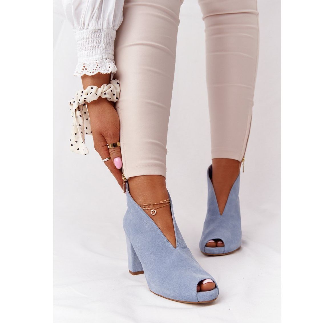 Details: Suede Booties On A Post With A Cut Exquisite 1243 Blue