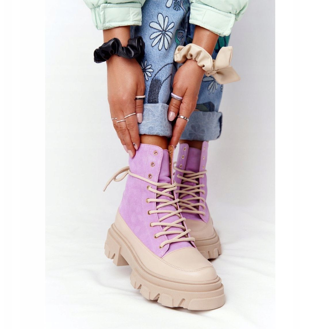The 15 cm shaft height provides adequate ankle support, and the unique combination of purple and beige makes these boots a standout element of your wardrobe. Remember that the numbering is exaggerated, so it is recommended to choose a smaller size.
