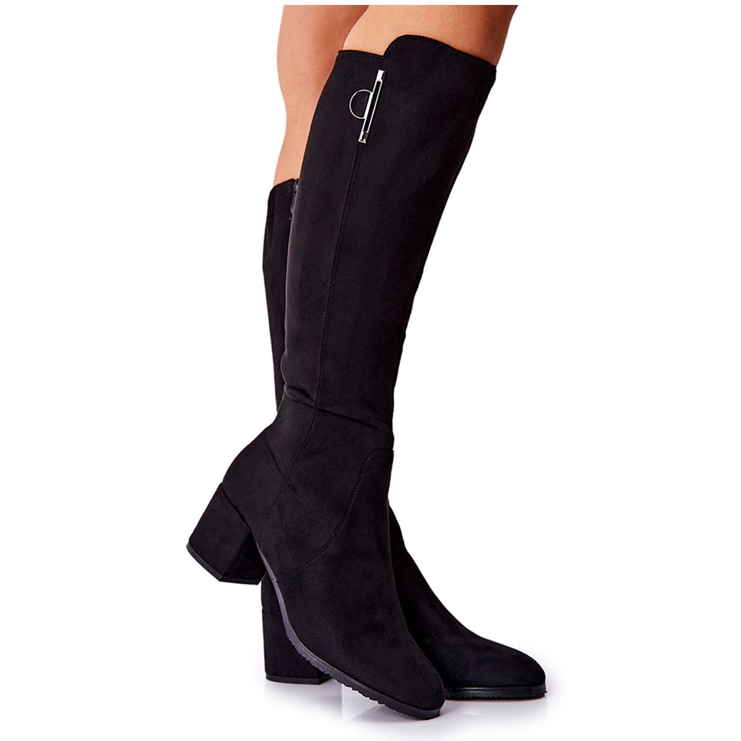 The boots are characterized by a delicate column, which not only adds a few centimeters of height, but also beautifully highlights the silhouette. Thanks to the zipper sewn on the side, putting on the shoes becomes quick and comfortable, which you will appreciate in everyday use. The upper, reaching to the knee, has been delicately decorated with an emblem, which gives them a subtle charm.
