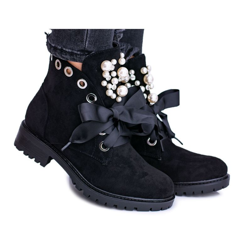Suede insulated boots with pearls and ribbon Black Perla is a must-have in the wardrobe of every fashionable woman who values comfort, quality and original design. Regardless of the occasion, these elegant boots will add style to any styling!