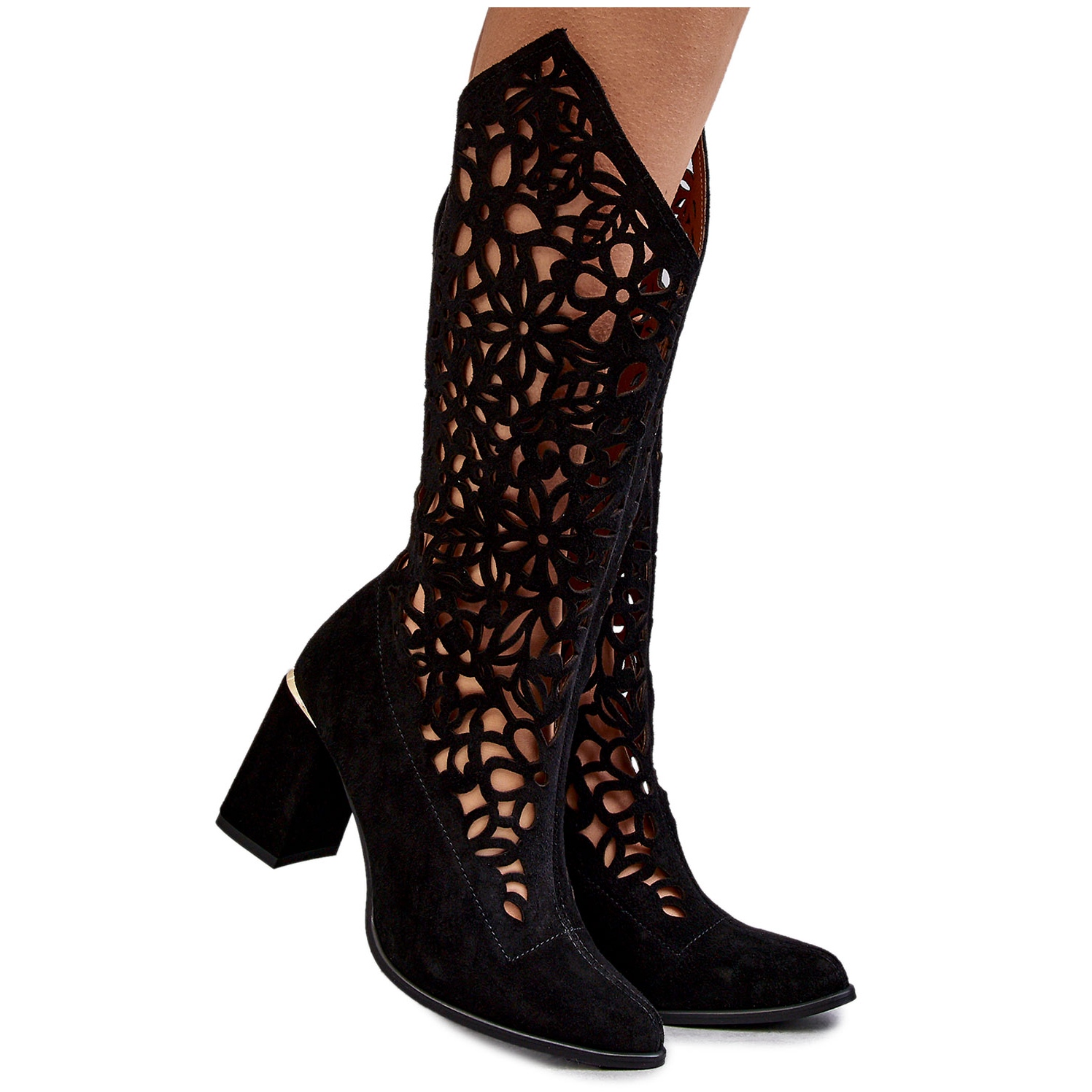 Discover elegance and style with suede openwork boots Lewski Shoes 3234 in black. These extremely effective boots, reaching to the knees, are the perfect complement to every women's wardrobe. The openwork upper gives them a unique character, and the scorer in the spitz adds a unique class.