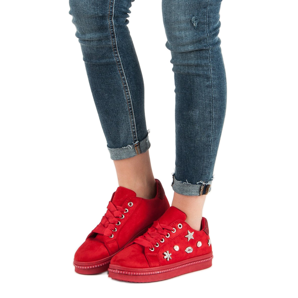 Details: Suede Sneakers With Rhinestones red
