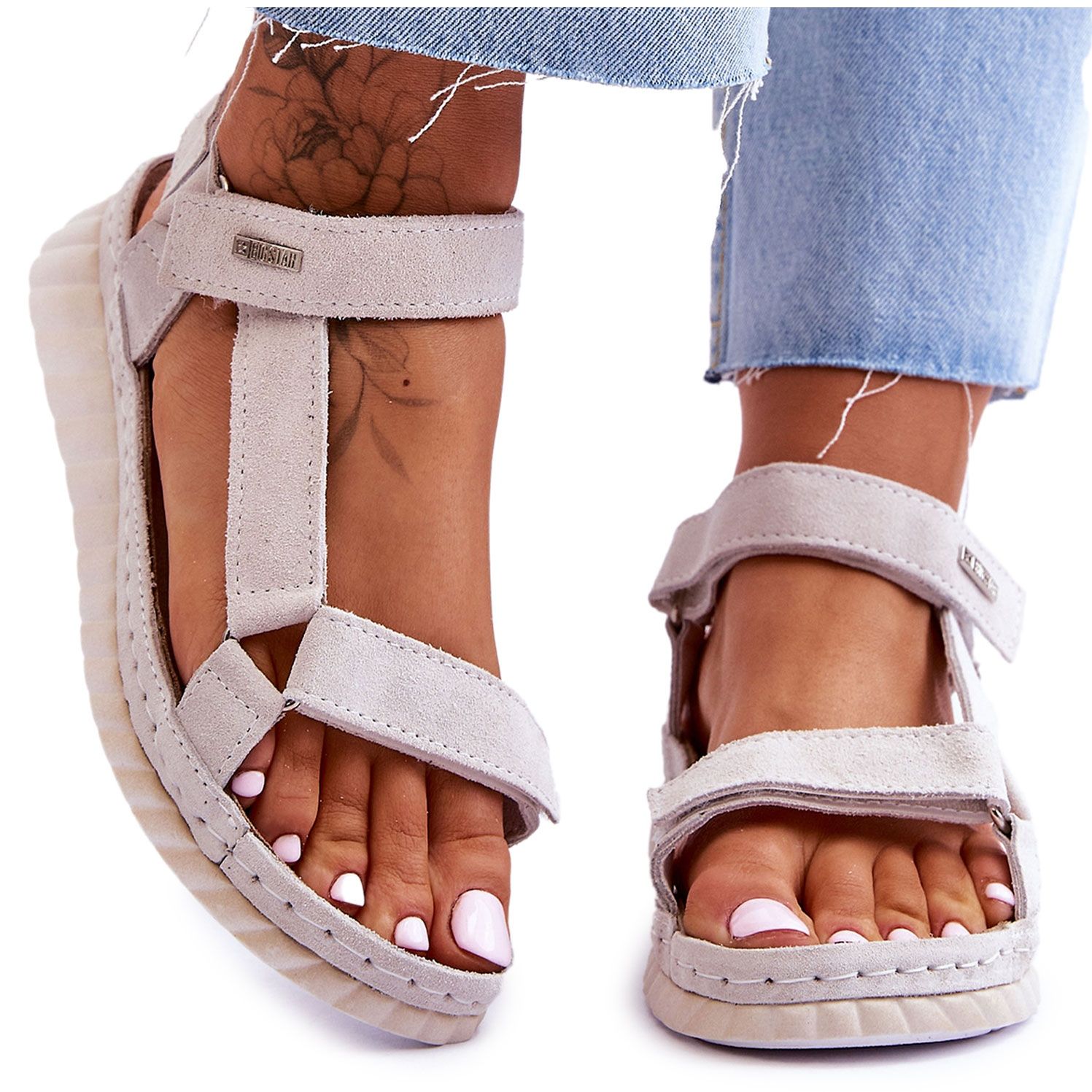 Suede Velcro Sandals Big Star LL276014 in beige are a great choice for warm days. Made of natural suede, these comfortable sandals combine elegance and comfort. Thanks to the Velcro fastening, putting them on and taking them off becomes extremely easy, making them the perfect model for any occasion.
