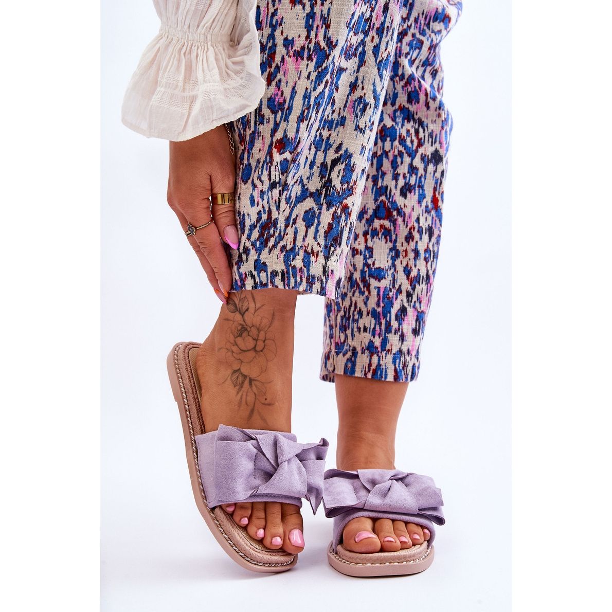 Elegant, and at the same time comfortable slippers, ideal for everyday stylizations in spring and summer. The upper made of ecological suede in a delicate shade of purple (lilac) decorated with a subtle bow. The insert and sole made of rubber plastic ensure comfort, flexibility and durability of use. The sole is non -slip, and around its edge there is a decorative string that adds character. The model is set on a low, flat heel (platform/sole about 1.5 cm), which guarantees stability and comfort throughout the day.