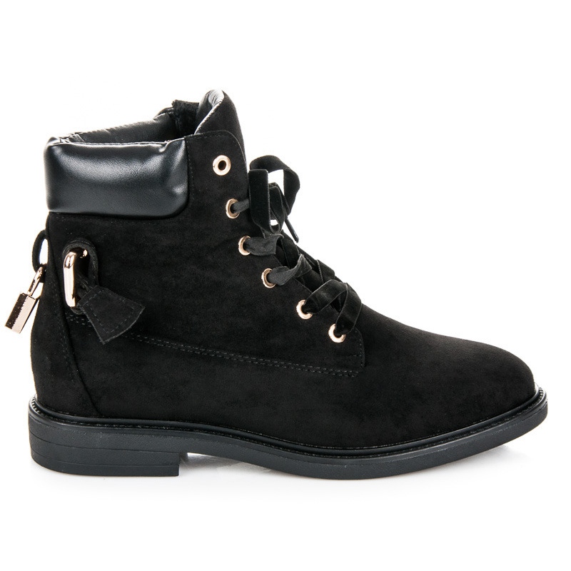 The characteristic element of the shoes is a decorative padlock hanging at the back, which adds a unique style and attracts attention. The lace fastening allows for a free adjustment to the foot. The round toe and the closed, stiffened heel counter increase the comfort of use, and the sole with a plastic tread provides good grip on various surfaces.