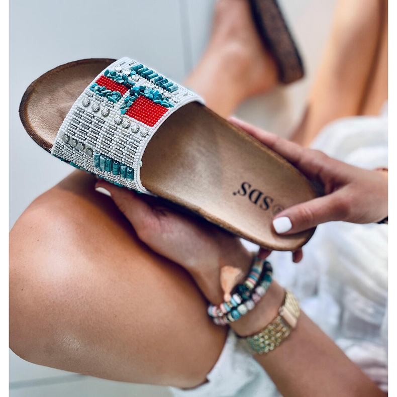 Taida White cork flip-flops are a great option for women who value comfort and style. Made of ecological suede, these white flip-flops impress with spectacular ethnic-style decorations that add a unique character to them. Thanks to the carefully profiled inner lining, covered with fabric, the flip-flops provide exceptional comfort, ideal for long summer walks.