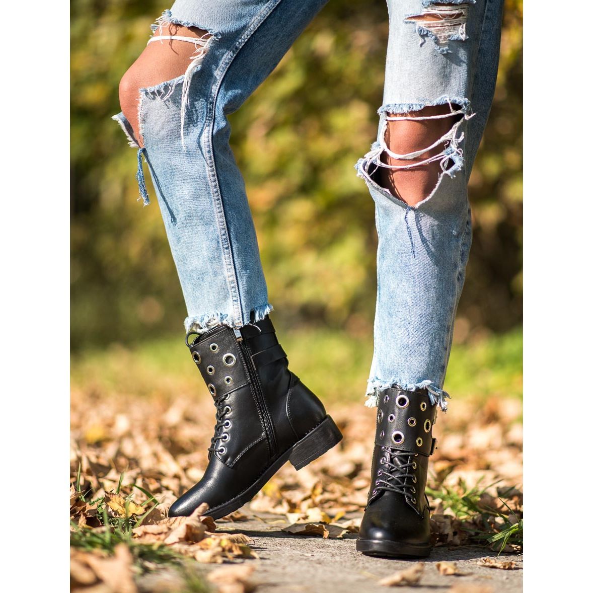 High uppers, reaching above the ankle, effectively protect the feet from cold and moisture, making them an excellent choice for colder days. A solid sole with a tread guarantees stability and comfort while walking. An additional advantage are the rhinestones and decorative buckles, which give the shoes a rock character and make them a fashion must-have in every wardrobe.