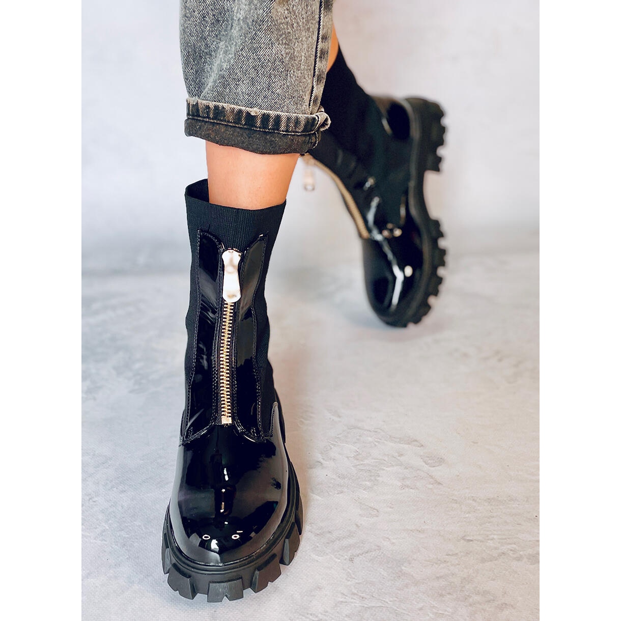 The black color with a patent finish emphasizes their extravagant character, and the decorative zipper on the front gives them a military, but also feminine accent. The high 5.5 cm thick sole not only adds height, but also ensures comfort during everyday activities. Thanks to the round toe and flat heel, these workers guarantee comfort of wearing all day long.