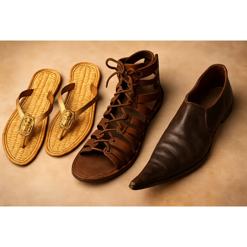 In ancient Egypt, sandals made of braided papyrus, reed or leather were popular. Their shape and material depended on the social position of the owner. Pharaohs wore ornate sandals with gold applications, while commoners went barefoot or in simple sandals. The Egyptians believed that footwear had spiritual significance and often placed them in graves as equipment for the afterlife.