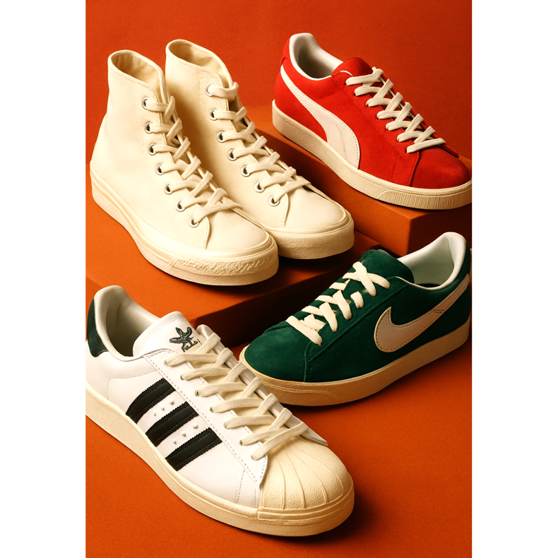 The 1950s were the era when sneakers began to cross the boundaries of sports fields. James Dean wore white sneakers in the film Rebel Without a Cause (1955), making them a symbol of youth rebellion. In 1958, Adi Dassler founded Adidas and his brother Rudolf founded Puma - both companies revolutionized sports footwear. The 1960s and 1970s were a golden time for the development of sports technologies: Nike founded in 1964 (initially Blue Ribbon Sports), the introduction of the Air air cushion (1979), Adidas Superstar (1969) as a basketball shoe. Sneakers became an integral part of hip-hop culture in the 1970s, particularly the Adidas Superstar and Puma Suede, worn by pioneers of the genre in the Bronx.