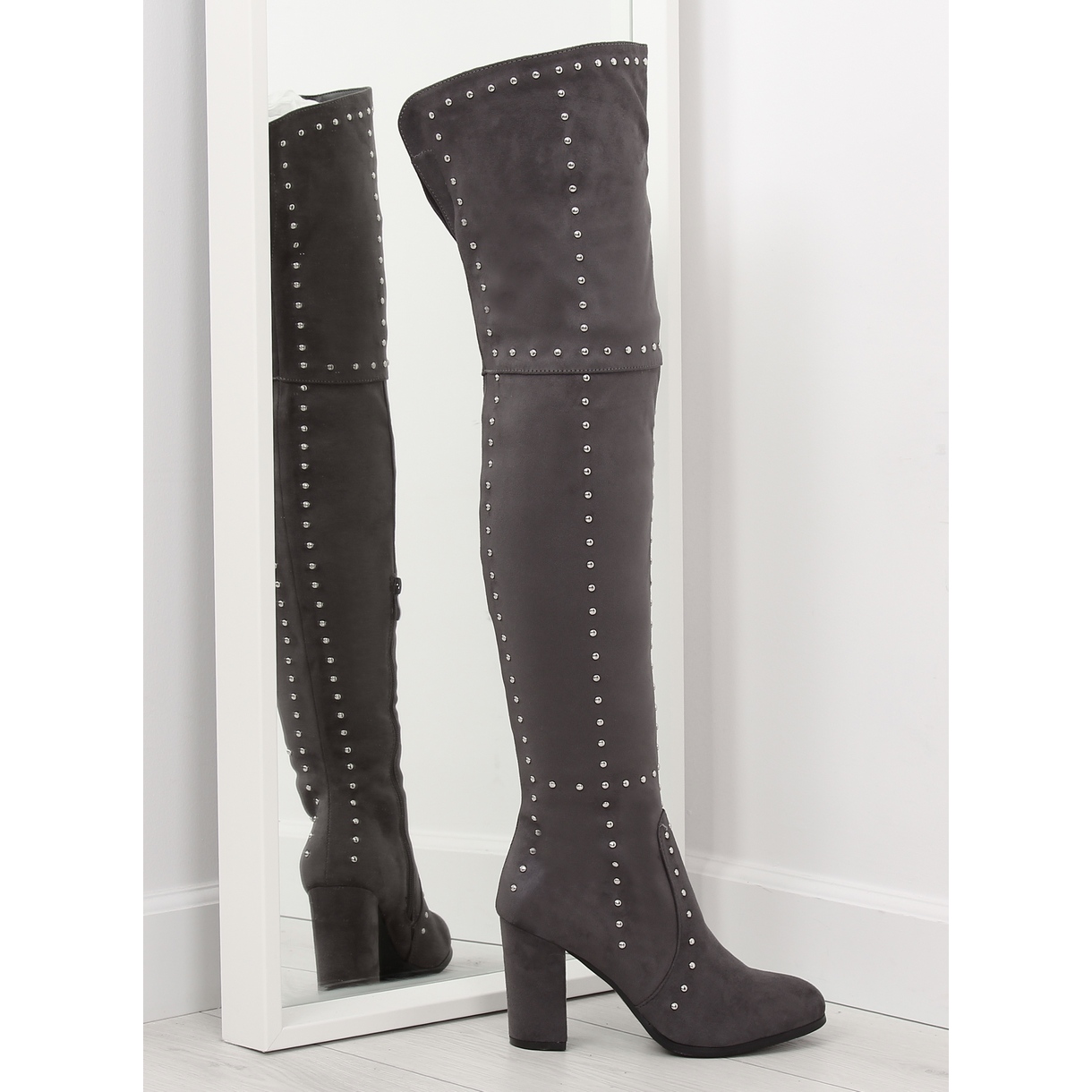 NC221 gray high-heeled boots - timeless elegance with character. The classic cut in a universal gray color is combined with a bold detail in the form of eye-catching studs that create a unique pattern and add an original expression to the shoes. Made of pleasant-to-touch ecological suede with foam lining, they provide a stylish look without compromising comfort.
