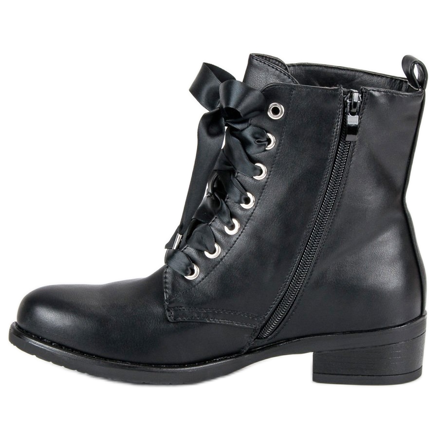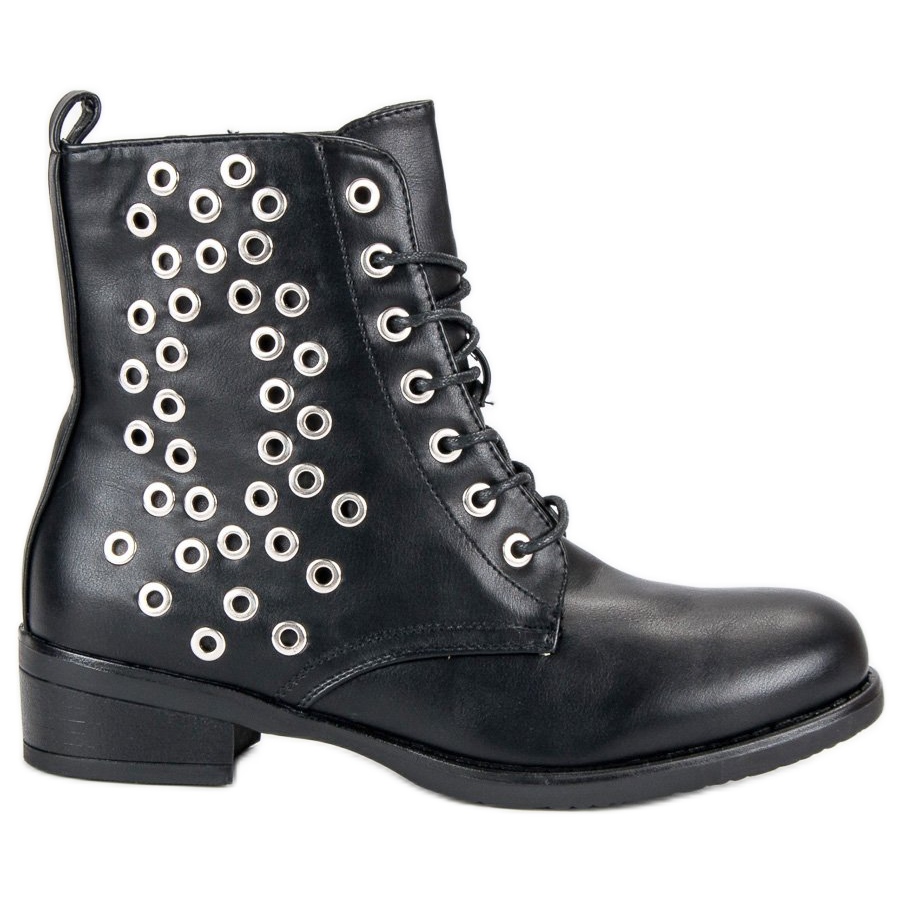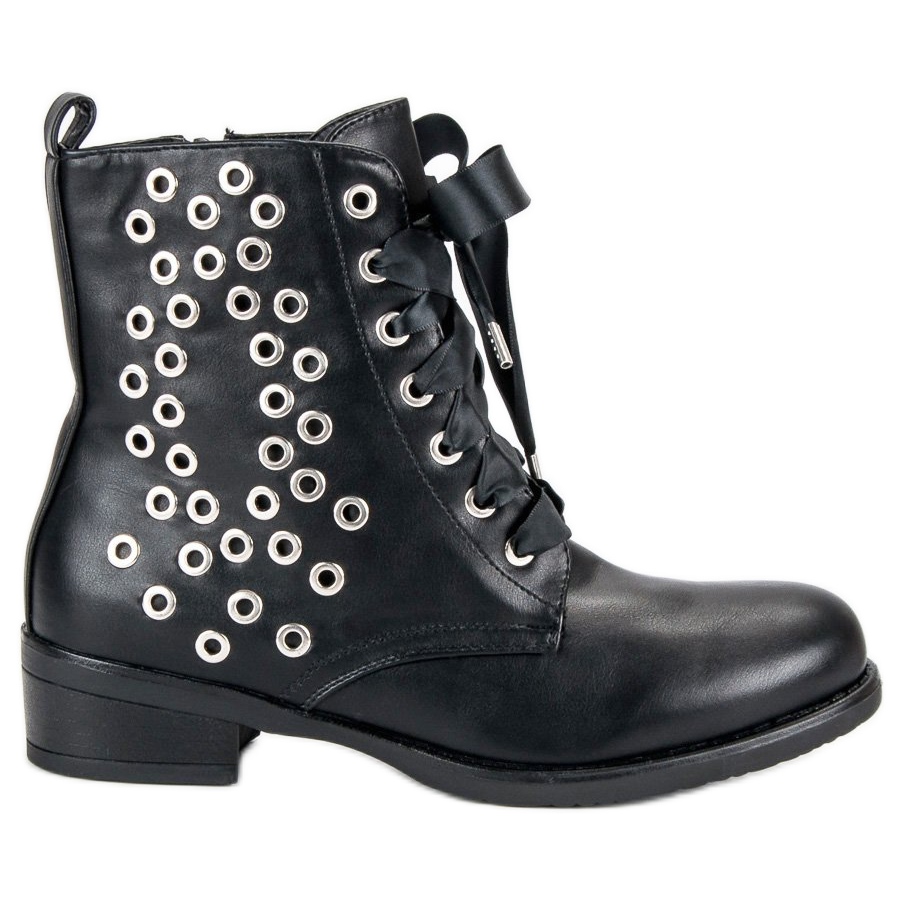 Looking for footwear that will add character to any style? Here is a great choice! Black lace-up workers are the perfect accessory for women who want to emphasize their individuality and style. Their elegant upper decorated with unique accents in the form of silver rhinestones on the side of the shoe gives them a predatory, yet fashionable look.