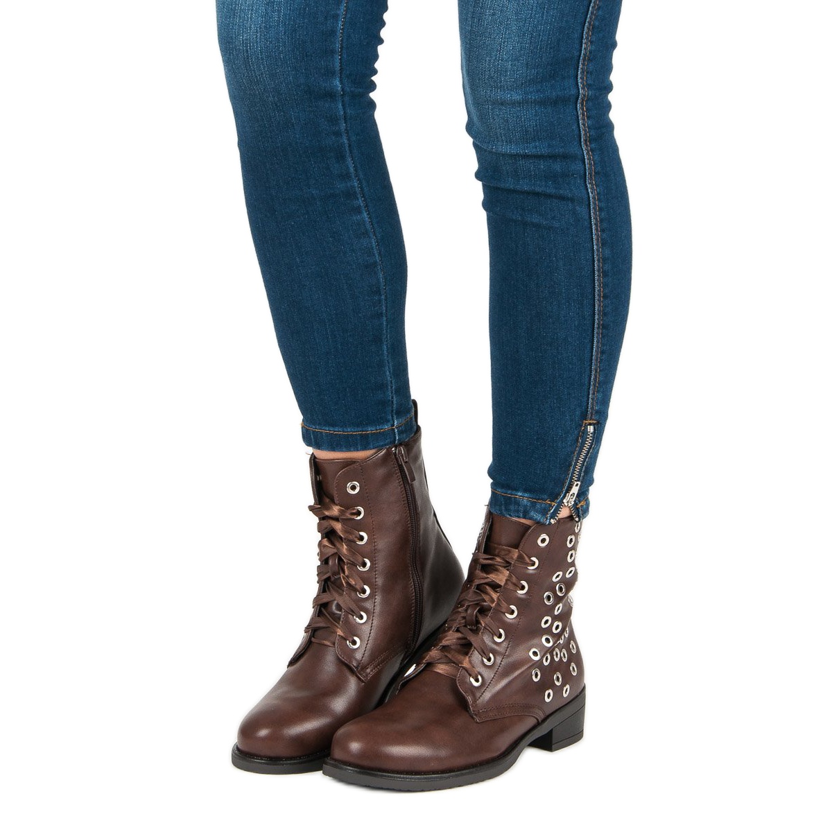 Brown workers are equipped with strong, brown laces and an effective side zipper, which not only emphasize their modern character, but also make them easier to put on. Additional decorations in the form of rhinestones give them a rock atmosphere, ideal for casual styling.