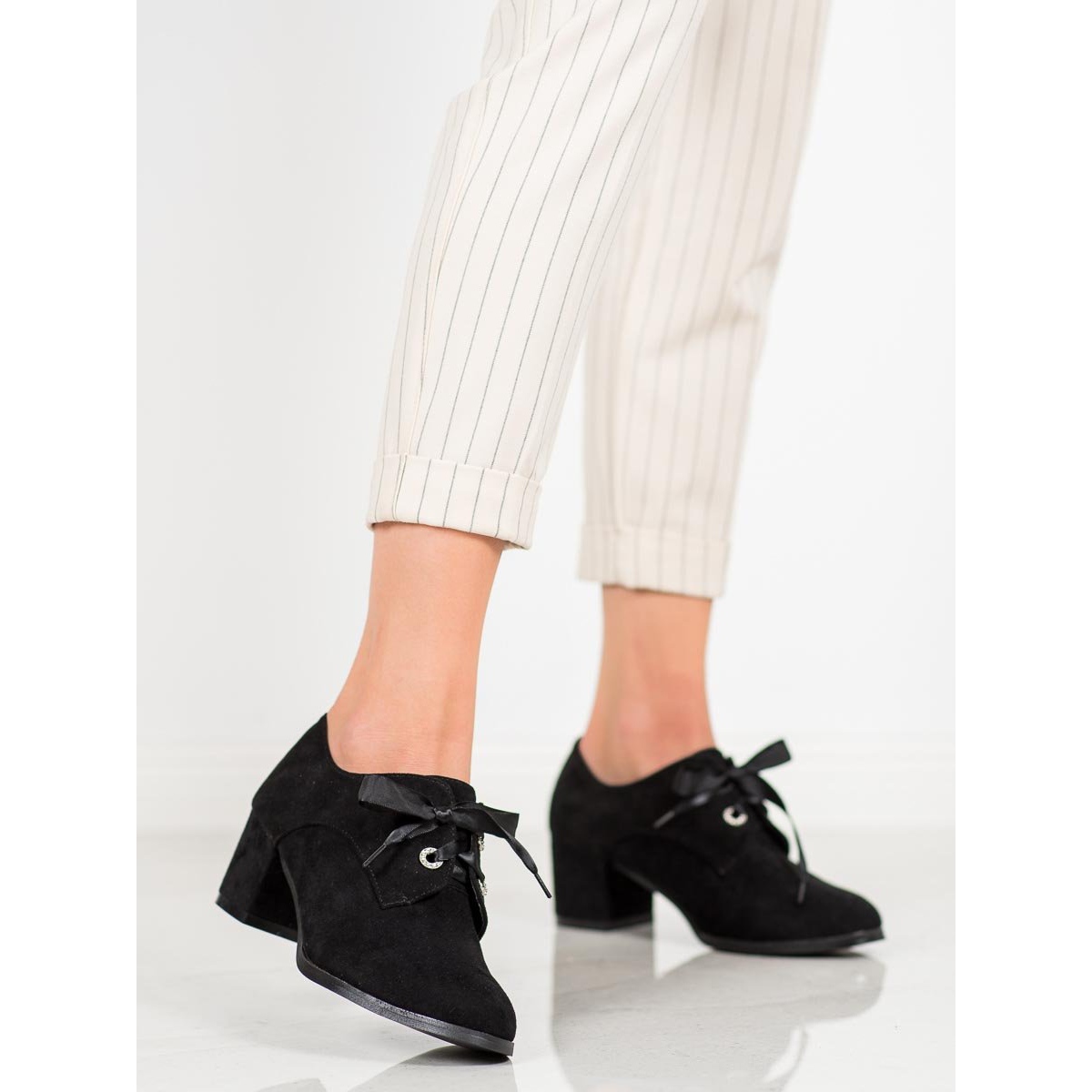 Discover the classic elegance in a modern edition - black lace-up pumps with a block heel from the manufacturer SHELOVET. These beautiful women's shoes have been carefully crafted from ecological suede, making them an ideal choice for people who prefer vegan products. Their classic, round toe and soft, closed heel ensure comfort of wearing all day long.