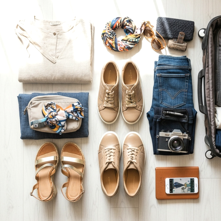 Sneakers + elegant loafers or ballet flats. Two pairs are enough for city sightseeing and evening dining. Choose neutral colors that match most clothes.