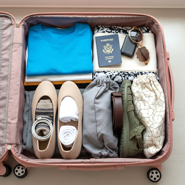 Use the inside of your shoes for small items: socks, underwear, chargers or a belt. This is a classic trick that saves a surprising amount of space. Place your shoes at the bottom of the suitcase, with the soles against the wall - they create a stable base for the rest of your clothes and do not dirty your wardrobe.