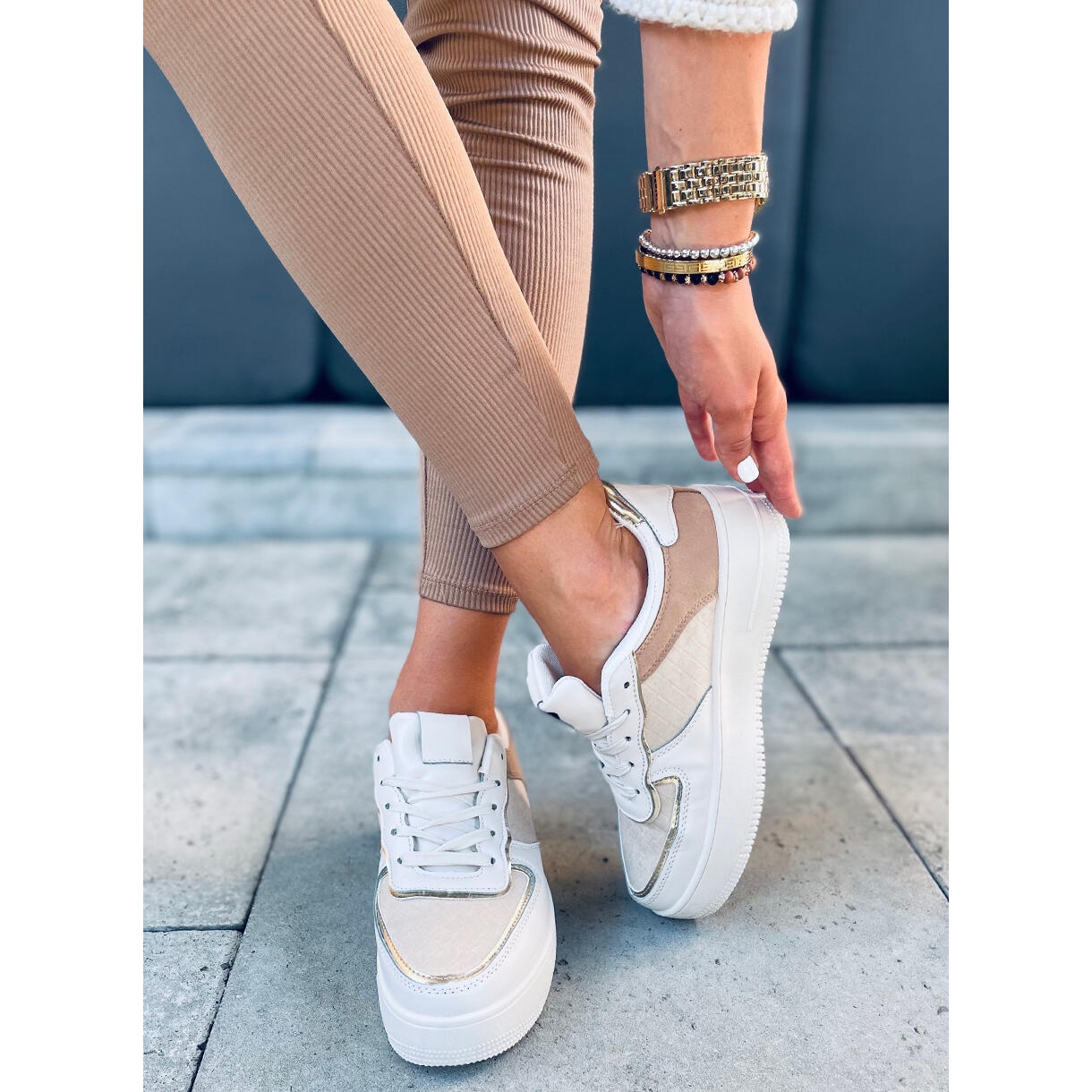 Ujusti sports shoes in beige are a great choice for women who value style and comfort. These lace-up shoes with a high sole (4.5 cm) are distinguished by a fashionable pattern in the glamour style and spectacular metallic inserts that attract attention and add character to any styling.