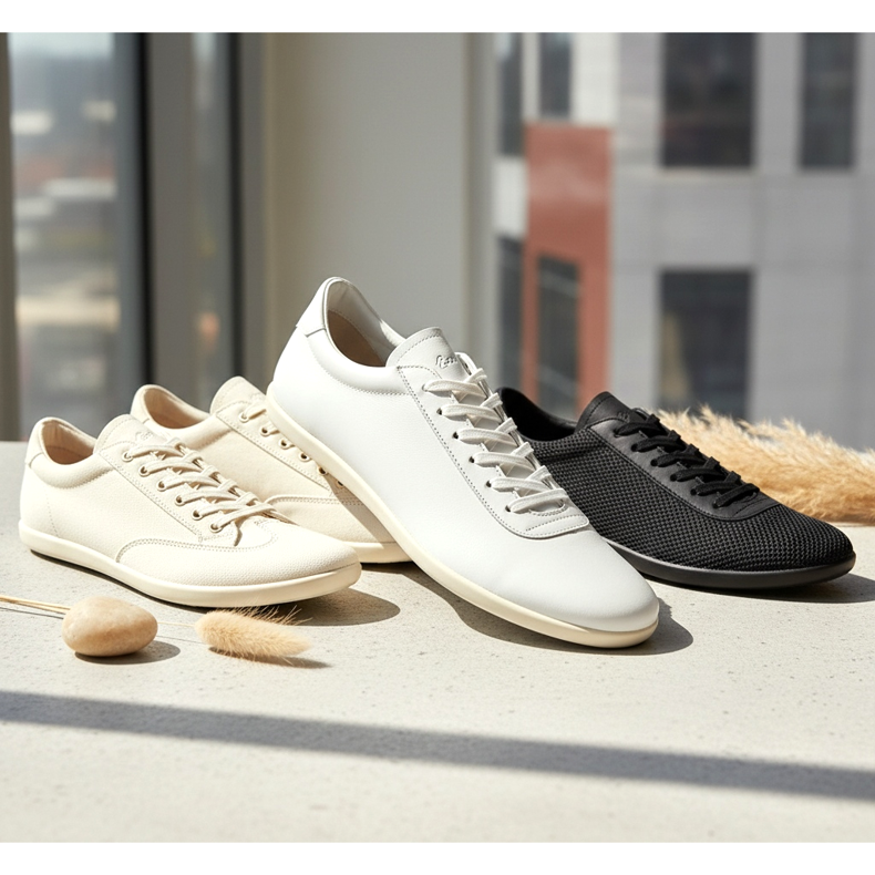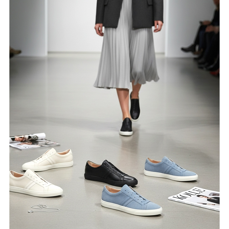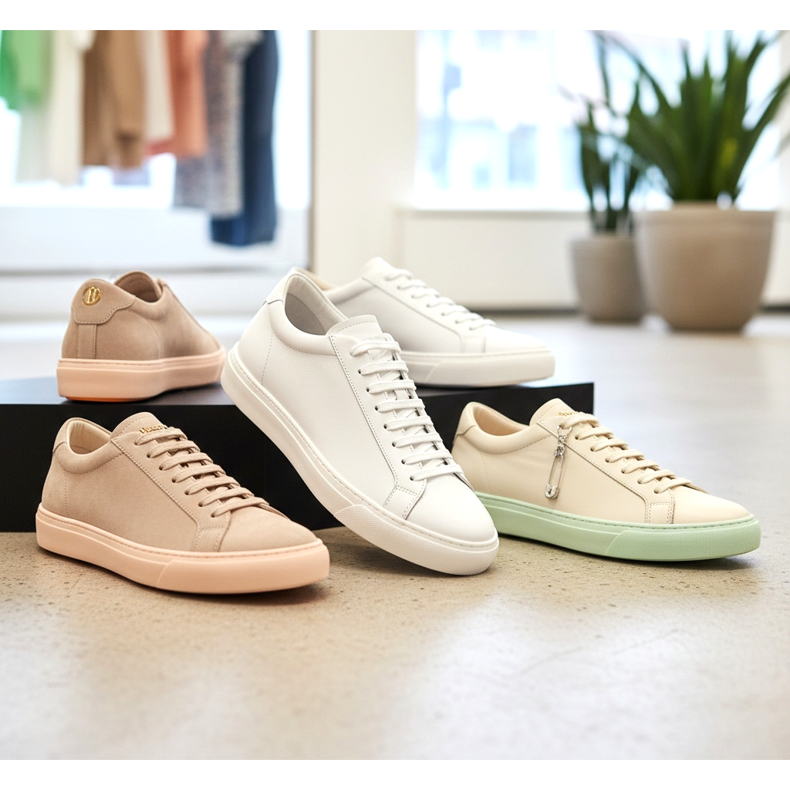 If you are looking for inspiration, take a look at the trends: the most desired in 2026 are ultra-slim sneakers in white and cream, made of full-grain leather with a minimum of stitching and decorative elements. A white sole against the background in the footer is the absolute minimum.
