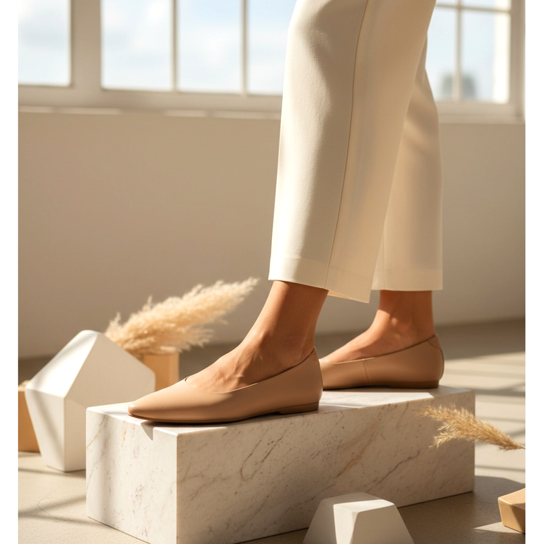However, the shoe's ultra-slim design — its slim profile and elongated toe — often makes up for the lack of a heel. The legs in such shoes look longer than in traditional flat sneakers with a round toe and a thick sole. A pair in a color similar to your skin tone or beige is especially recommended for shorter people - the optical lengthening effect is really noticeable.