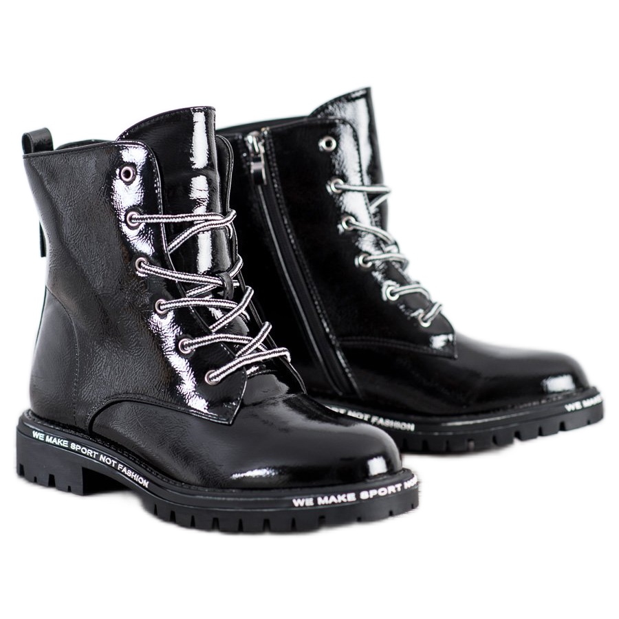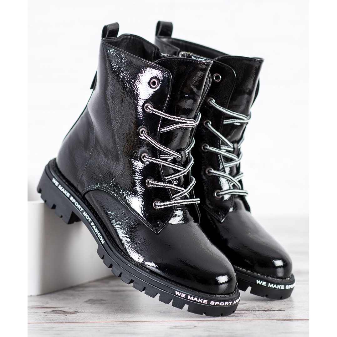 We present unique trappers from the renowned brand Goodin, which combine fashionable design and comfort of wearing - ideal for the autumn/winter season. These patent boots, in white with black accents, will certainly attract attention and will be a perfect complement to any casual and rock styling.