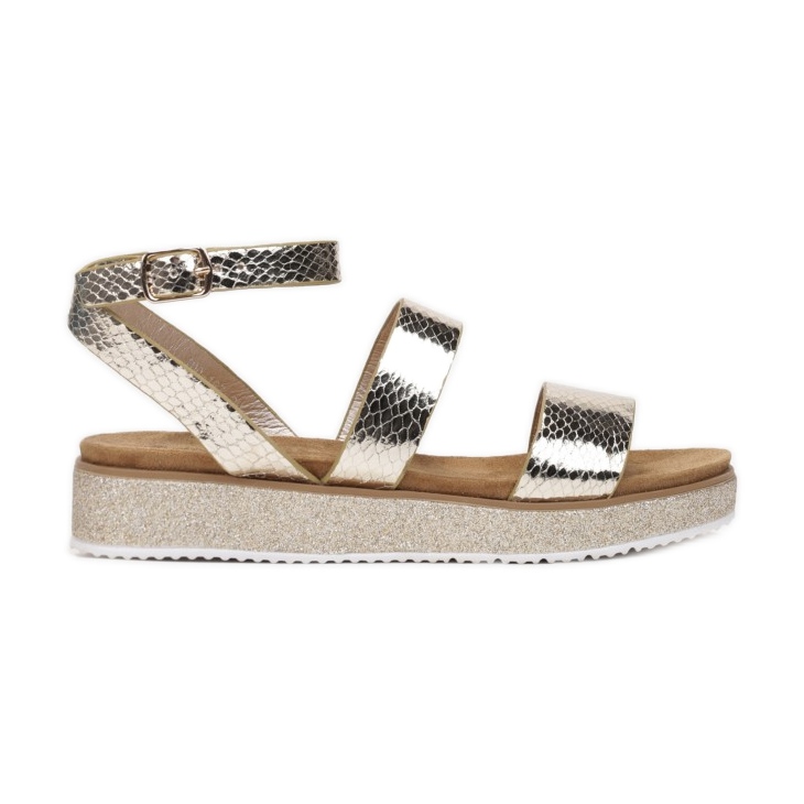 The sandals are distinguished by an effective glitter finish that attracts attention and adds shine to any styling. Decorative straps with shine and embossing give them a unique character. Additionally, the comfort of wearing is ensured by the buckle on the ankle, thanks to which you can perfectly adjust the sandals to your foot.