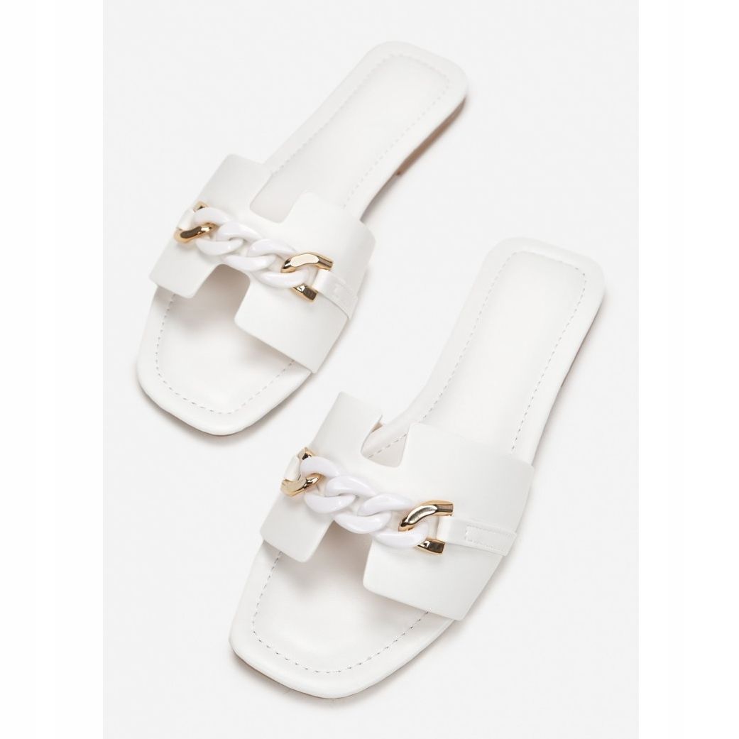 Vices 2136-71 flip-flops in an elegant white color are the perfect choice for every woman looking for comfort and style every day. These slip-ons are characterized by an open square toe, which gives them a modern look. A wide strap at the toes, decorated with a spectacular chain in a matching color, adds character and makes the flip-flops not only comfortable but also fashionable.
