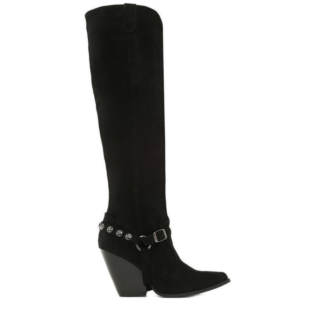 The boots are characterized by a shaft reaching above the knee and an almond toe, which gives them an extremely feminine and elegant look. Thanks to the comfortable 9 cm block heel, you can enjoy both style and comfort of wearing for a long time.