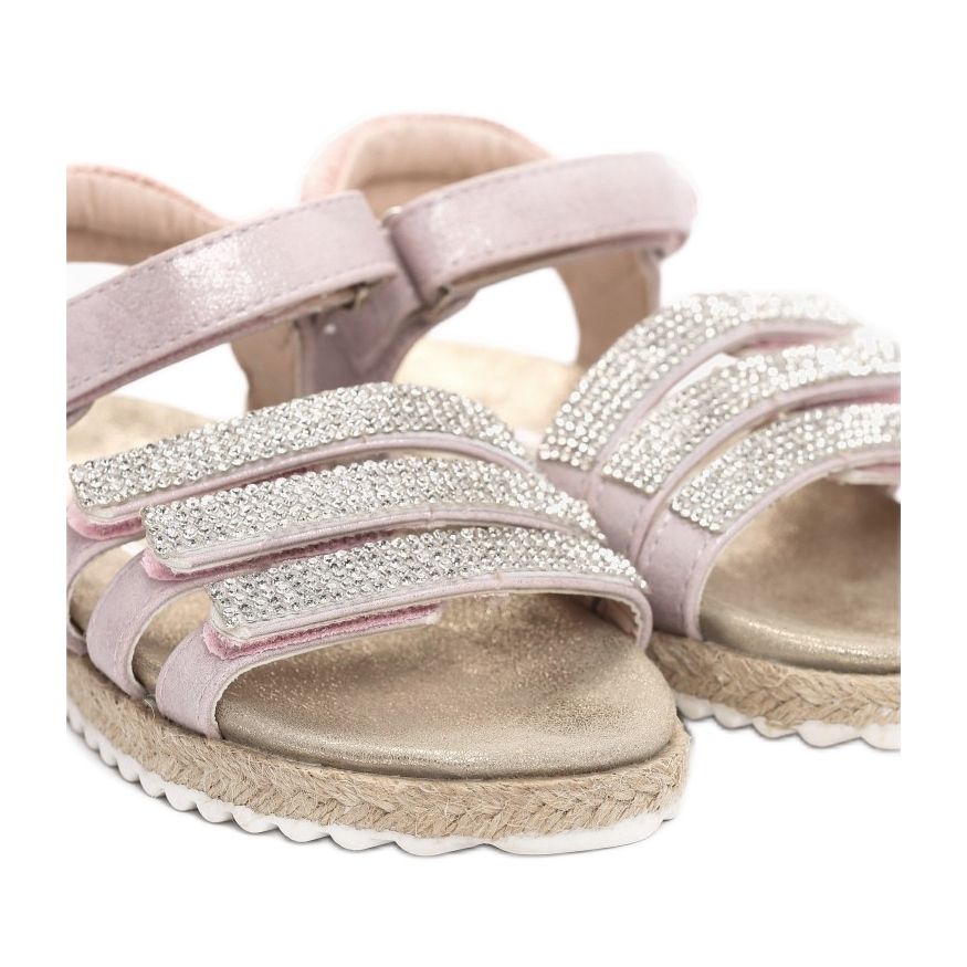 These sandals are fastened with a practical Velcro, which makes them easy to put on and take off. The open toes and open heel add lightness and allow the feet to breathe freely on hot days. Three straps at the toes decorated with elegant imitation zircons give them a girlish charm, and decorative braids around the sole emphasize the unique style.