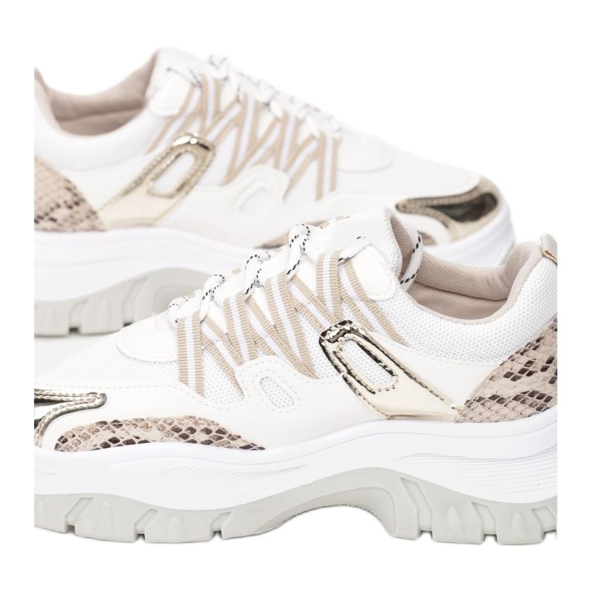 Vices 8540-42 sneakers in beige are the perfect choice for women who value comfort and a fashionable look. These lace-up sports shoes are distinguished by a thick, two-color sole that adds character and stability. The upper made of eco-leather and textile material has been decorated with a stylish imitation snakeskin, which makes these sneakers a unique element of any styling.