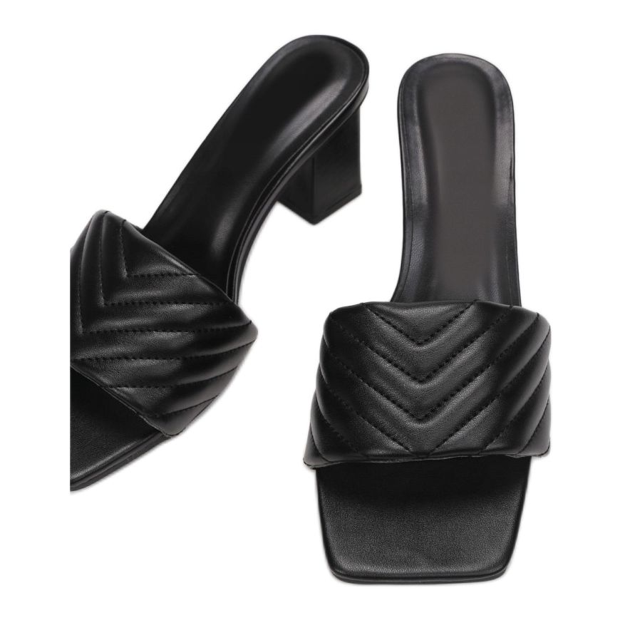 The distinguishing feature of the model is the wide 7 cm high post heel, which provides stability while walking, and at the same time adds charm to any styling. The wide strap at the toes, decorated with diagonal quilting, beautifully matches the elegant line of the flip-flops, giving them a unique character.