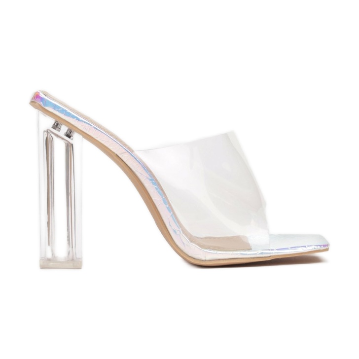 The high, 11 cm block with a square base adds style and makes every silhouette look phenomenal. The wide strap located at the front effectively supports the toes, providing stability while walking. Transparent materials used in the heel and strap give a liked lightness and modern look.