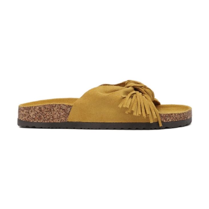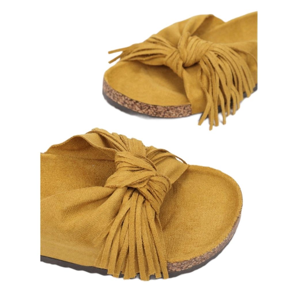 The wide strap at the toes, tied with a matching strap with decorative fringes, attracts attention and gives the flip-flops a unique character. Made of high-quality eco-suede, the flip-flops combine elegance and practicality, and their synthetic sole guarantees durability and comfort throughout the day.