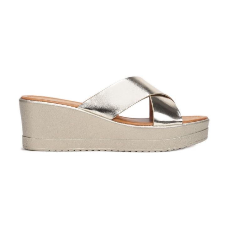 Discover exceptional style and comfort with the Vices MULANKA-2150-60 platform mules in a beautiful gold color. These elegant mules combine fashionable design with practicality, making them the perfect choice for everyday wear. The rounded open toe and two wide, crossed toe straps provide comfort and stability with every step.