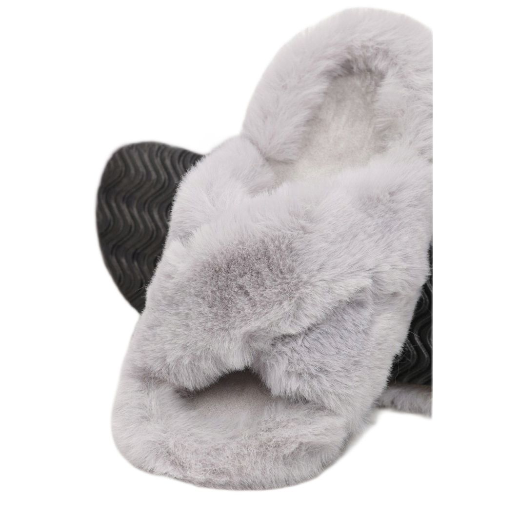 The model is slip-on, which makes putting them on and taking them off very easy and quick. The stabilizing, crossed straps at the toes not only captivate with their appearance, but also guarantee good foot stability. Made of material imitating fur, these flip-flops pleasantly wrap the feet, providing them with warmth and comfort, ideal for evening moments of relaxation in the privacy of your home.