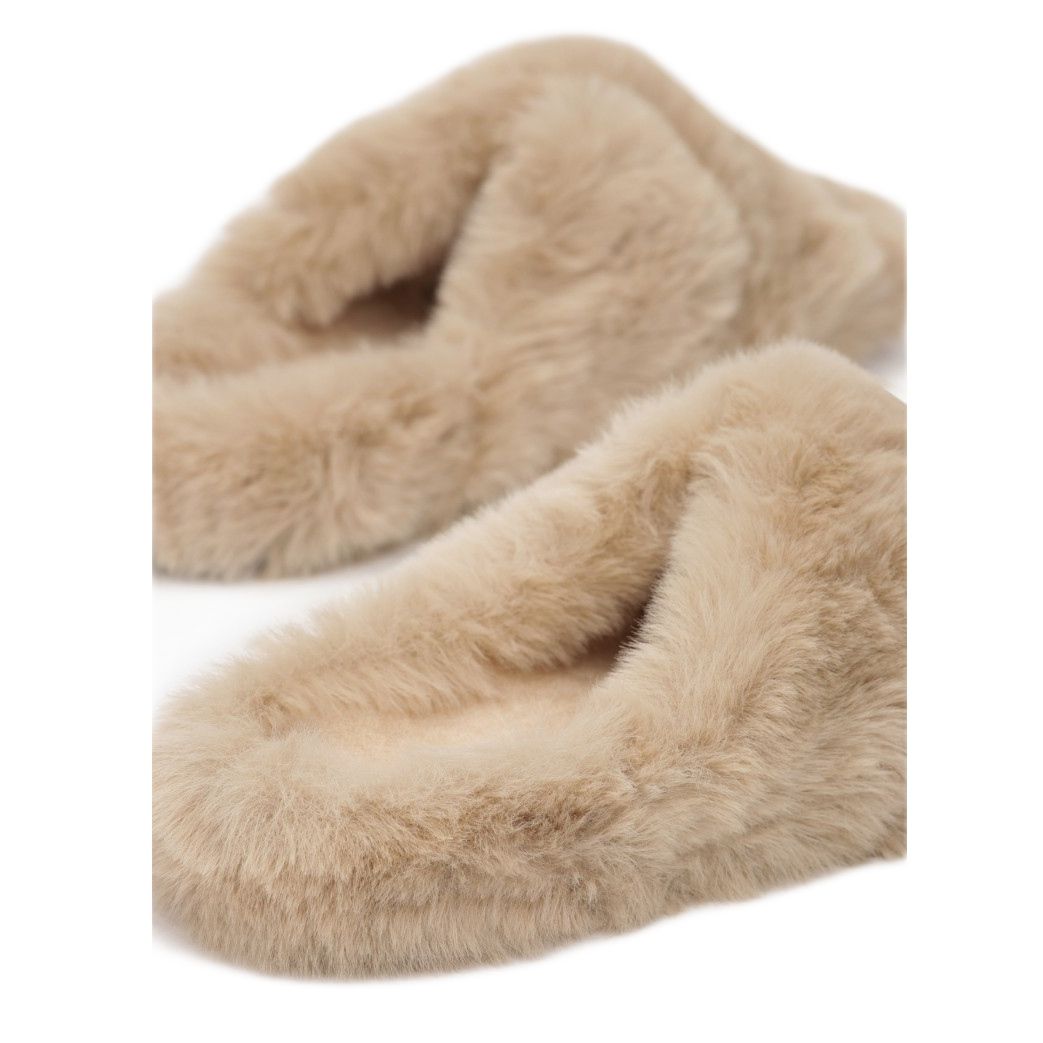 This model is distinguished by two crossed, stabilizing straps at the toes, which not only add style but also provide adequate support. Made of material imitating fur, these flip-flops provide a pleasant experience when worn, and the eco-suede insole guarantees softness and comfort for the feet.