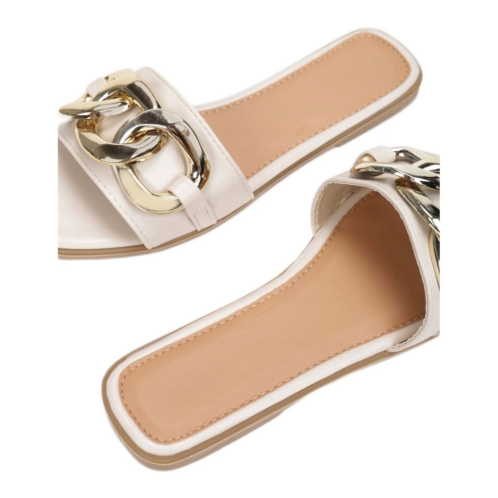 The comfortable slip-on fastening makes these flip-flops a great companion both on warm summer days and during relaxing moments at home. The wide strap at the toes, subtly decorated with a gold chain, adds a unique character, making every styling elegant.