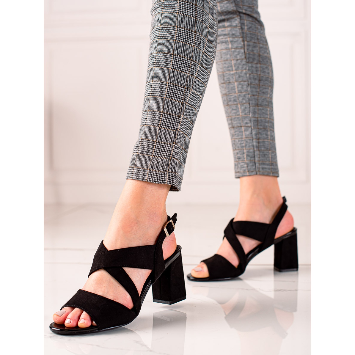 The sandals are characterized by an open heel and no toe, which provides maximum comfort and breathability. The 8 cm high heel in the form of a column adds chic while stabilizing the step. Made of high-quality imitation suede and ecological leather, these sandals are not only stylish but also ecological.